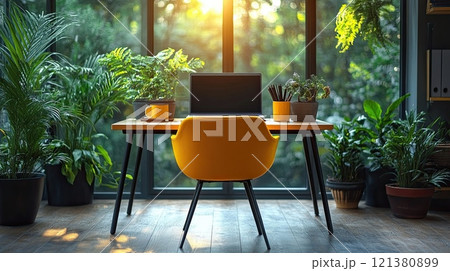 Yellow office chair placed in front of the table with a laptop and a coffee mug