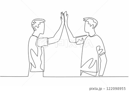 Continuous one line drawing two men in casual clothes doing a high five. Two friends meet again. Warm greetings of friendship. National High Five Day. Single line draw design vector illustration
