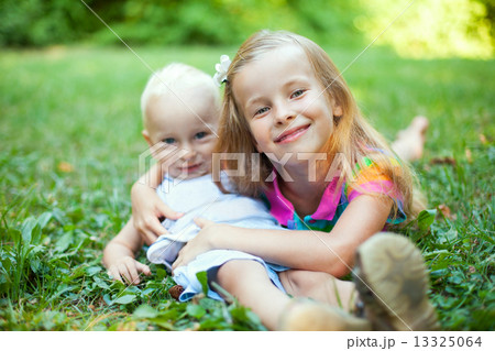 Sister and brother lying on green grass