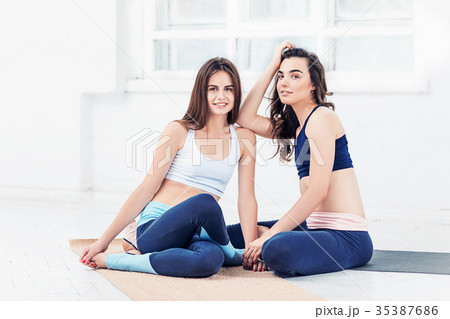 Two young sporty women posing at gym.