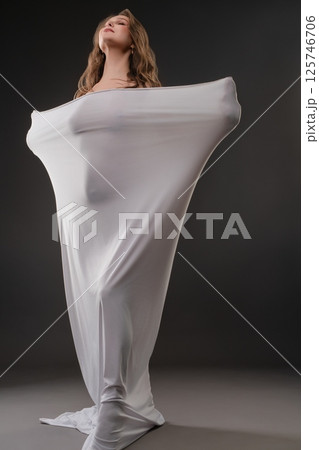 Pregnant woman gracefully posed in flowing white fabric for artistic beauty