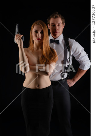 A dramatic close-up portrait of a man and woman with piercing blue eyes, set against a dark background, exuding confidence, intensity, and mystery