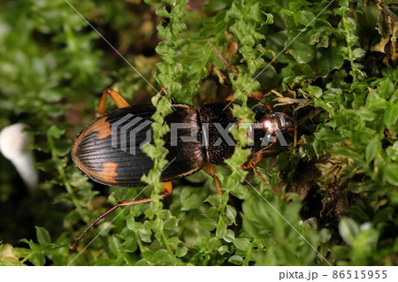 生き物 昆虫 アトワアオゴミムシ、光沢のある一センチ強の体。翅端のコンマかC字に見える模様が特徴