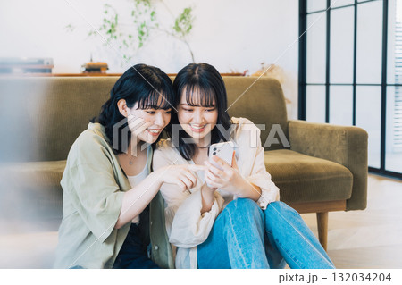 部屋でスマホを見る笑顔の女性2人組