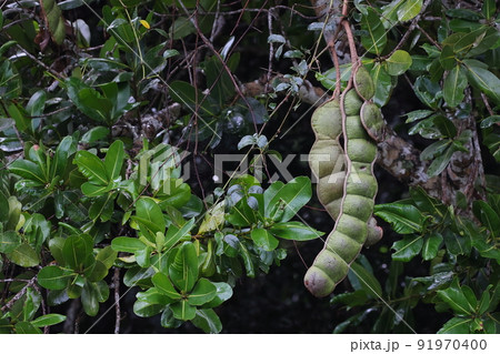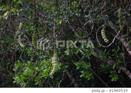 自然 観察 ヒメモダマ、六月の石垣島。頭上に垂れ下がる豆果、長いものは五十センチを超えます