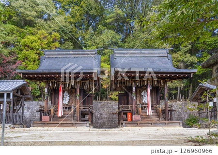 秋の京都 紅葉が美しい石座神社 (左)十二所明神(右)八所明神