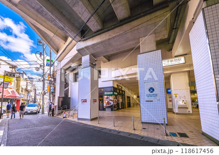 日本の川崎都市景観 9月。高架下の二子新地駅東口。駅前の商店街・二子大通り商和会などを望む