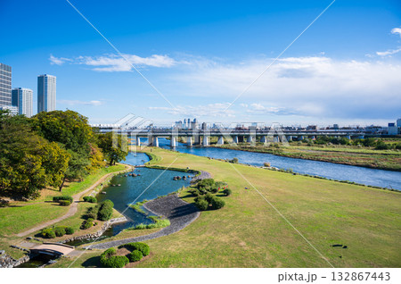 二子玉川の都市景観 緑豊かな多摩川と二子玉川駅のビル群【東京都・世田谷区】