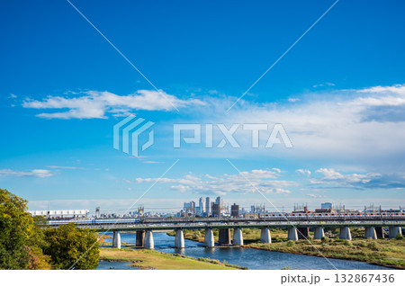 多摩川を渡る電車と二子玉川駅周辺の街並み 東京都世田谷区