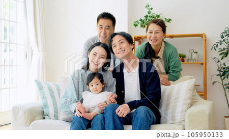 部屋でくつろぐ赤ちゃんと三世代家族