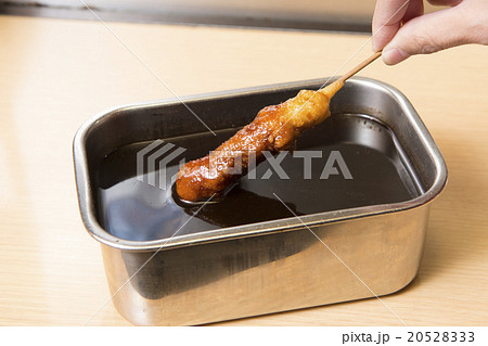 タレに漬けた串カツのイラスト。「二度漬け禁止」文字入りです。