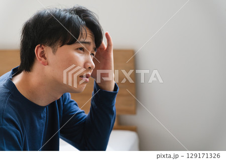 頭痛を覚える寝起きの若い男性 ライフスタイルイメージ