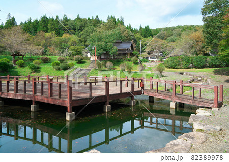 牧水二本松公園の水上ステージと熊谷屋 岡山県新見市
