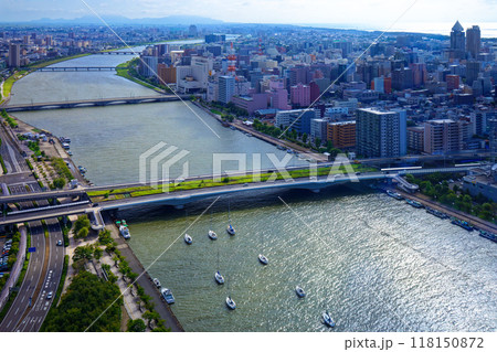メディアシップ展望台より柳都大橋と新潟市歴史博物館方面の街並みを望む