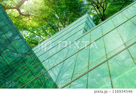 Glass office building surrounded with green trees. Eco-friendly office building. Sustainable architecture of city reducing heat carbon dioxide modern city environment.