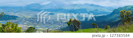 阿蘇五岳を背景に阿蘇市街地パノラマ絶景風景「 豊後街道・二重峠石畳の道(新緑)」阿蘇市