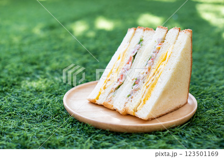 Homemade Sandwich, fried egg with crab stick, vegetable salad and mayonnaise served on a circular wooden dish.