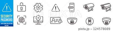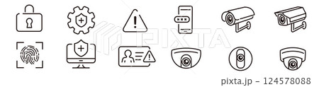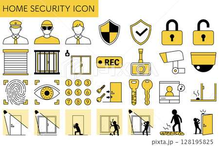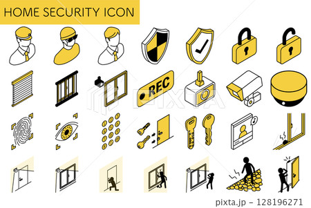 防犯・ホームセキュリティの白黒アイコンのアイソメトリックイラスト