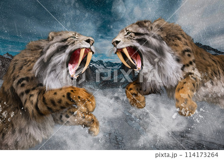 吹雪の中二頭のサーベルタイガーが戦う