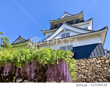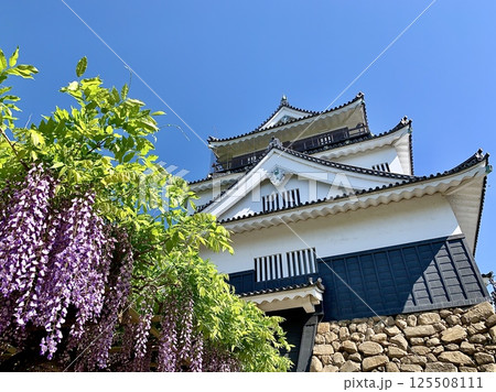 満開の五万石藤と青空に彩られた岡崎城天守閣を仰ぎ見る〈岡崎城公園/愛知県岡崎市〉