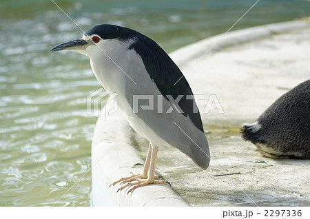 上野動物園のケープペンギンと餌の横取りを狙うゴイサギ