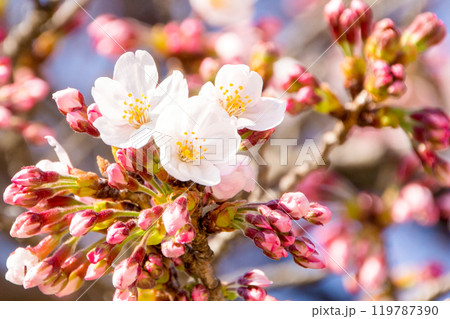 東京スカイツリーを背景に咲く桜 咲き始めた桜