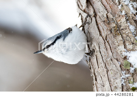 冬の森で木の幹にとまるゴジュウカラ