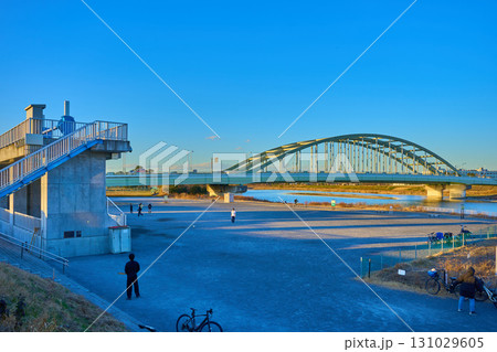 日没後の東京都狛江市の多摩川河川敷から西側の眺望(多摩川,多摩水道橋交差点,富士山,ブルーアワー)