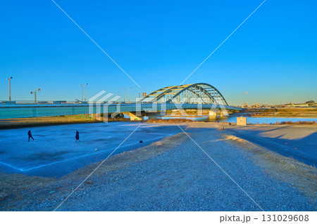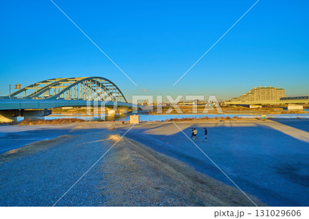 神奈川県川崎市多摩区登戸の稲田多摩川公園にある五反田川放水路付近から多摩水道橋方面を見る