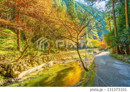岐阜県八百津町 剣豪宮本武蔵が修行したと言われる伝説がある秋の五宝滝へ向かう道沿いに見える川と紅葉