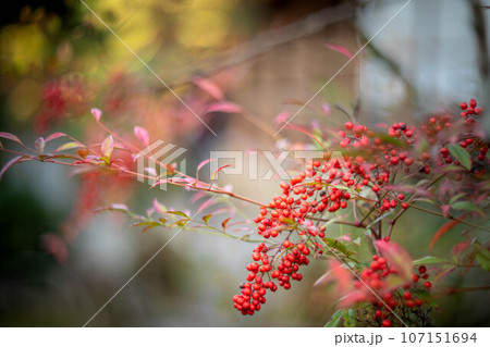 等持院の秋、色づきはじめの紅葉、赤い南天の実