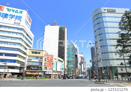 日本の東京都市景観 池袋駅西口のカラオケ店などが並ぶ繁華街などを望む