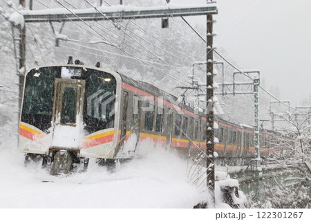 吹雪くみなかみ町を行く上越線E129系電車(水上⇔長岡)