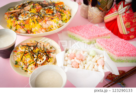 ひな祭り 桃の節句 ちらし寿司 ひな菓子 五目ちらし 雛人形 雛あられ 甘酒 お祝い ご馳走 白酒