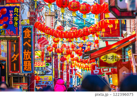 日本の横浜都市景観1月。横浜中華街・市場通り。いつもと変わらない赤提灯や占い…などが出迎えてくれる