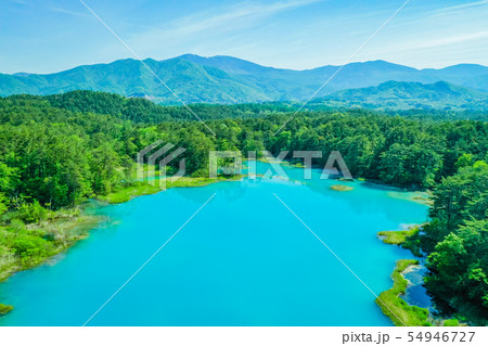 弁天沼、ドローン、コバルトブルー、エメラルドグリーン、空色、五色沼、裏磐梯、福島、神秘的な沼