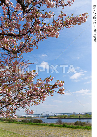 荒川の川原の満開の江北五色桜と青空