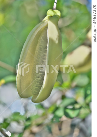 自然 植物 ムベ、七月の若い果実。緑色の果実、周りには特徴的な葉脈を持つ掌状複葉