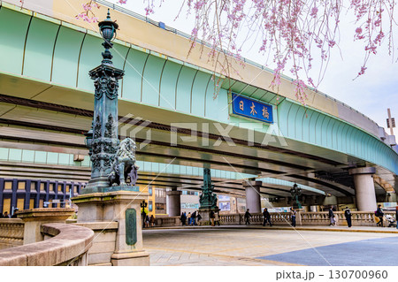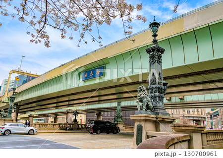 東京・日本橋 日本橋親柱の獅子像と首都高速