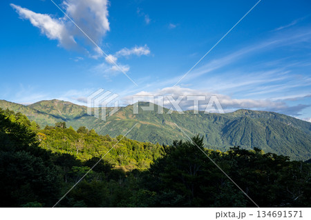 白馬岳蓮華温泉ロッジから見る朝日岳と五輪山 蓮華温泉~北アルプス白馬岳縦走登山