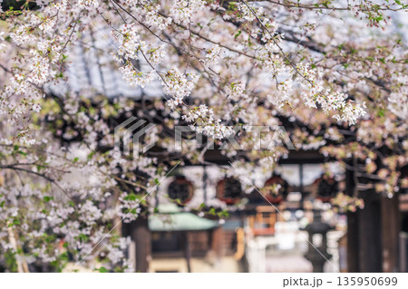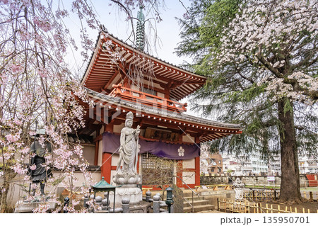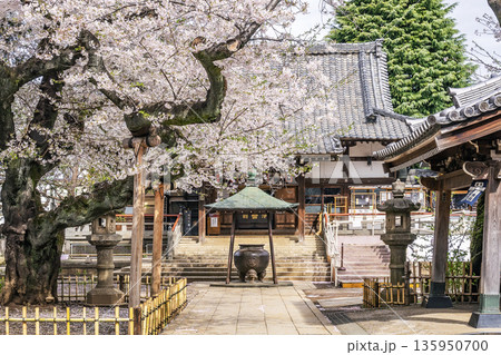 満開のシダレザクラに彩られた新井山梅照院(新井薬師)の薬師霊堂