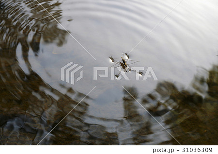池の水面に捕食事中で交尾中のアメンボウ-2