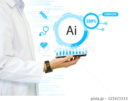 A doctor in a white lab coat holding smartphone surrounded by digital representation of artificial intelligence, health, and research icon. The setting is bright and futuristic.