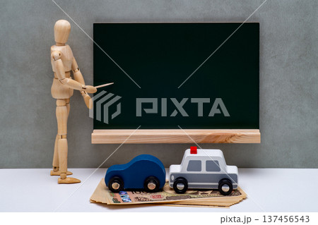 黒板を示すデッサン人形と交通違反と反則金のイメージ