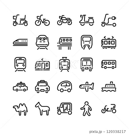 交通手段・乗り物のシンプルな線画アイコンセット/白背景