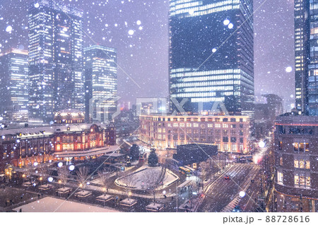 《東京都》雪景色の東京駅・大雪警報の都心