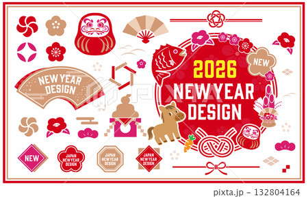 正月のイラストセット。年賀はがきや正月のセールに使えるアイコンセット