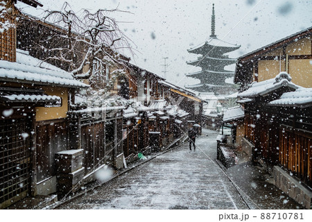 冬の早朝に雪舞う京都市東山区の八坂の塔へ歩く