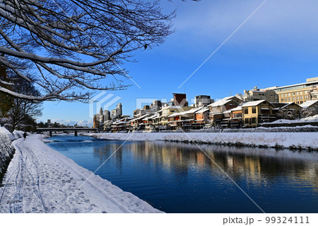 冬の朝の京都市鴨川 四条大橋北の雪景色