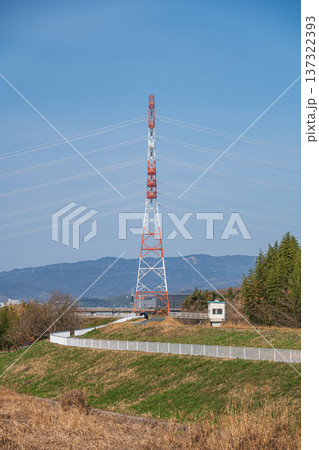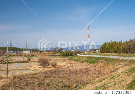 田園の中に立つ鉄塔と木津川堤防上のサイクリングロード 京都府京田辺市